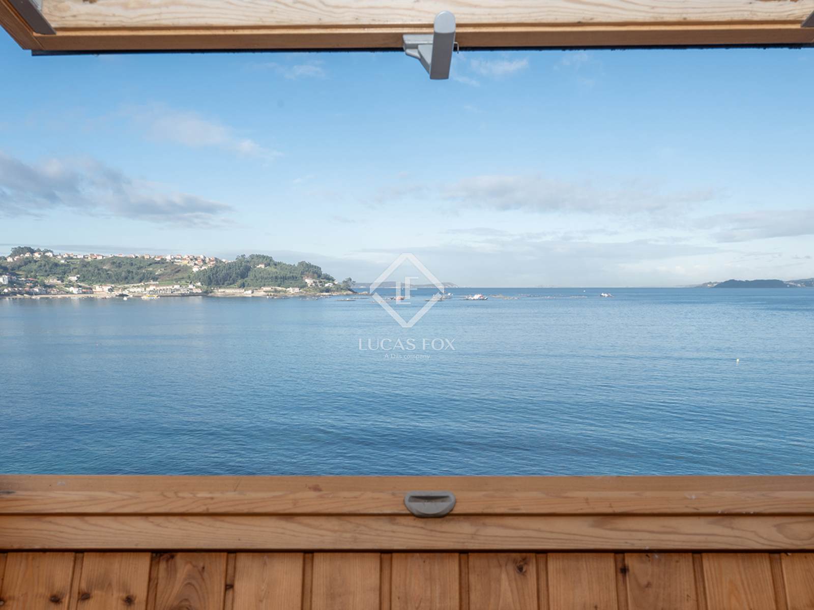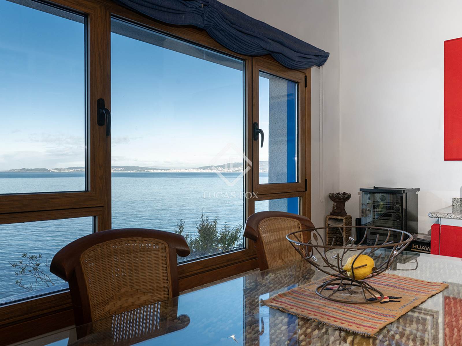 Plus loin, on trouve des toilettes pour les invités, puis un espace de vie comprenant une cuisine ouverte sur la salle à manger, un espace spacieux doté d'une grande fenêtre offrant une vue imprenable sur l'estuaire. De là, on aperçoit les îles Ons et la ville de Sanxenxo.