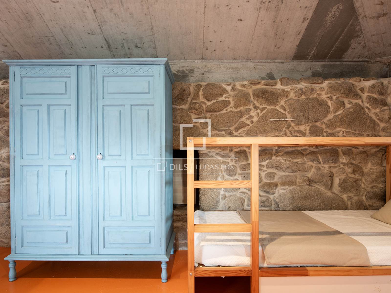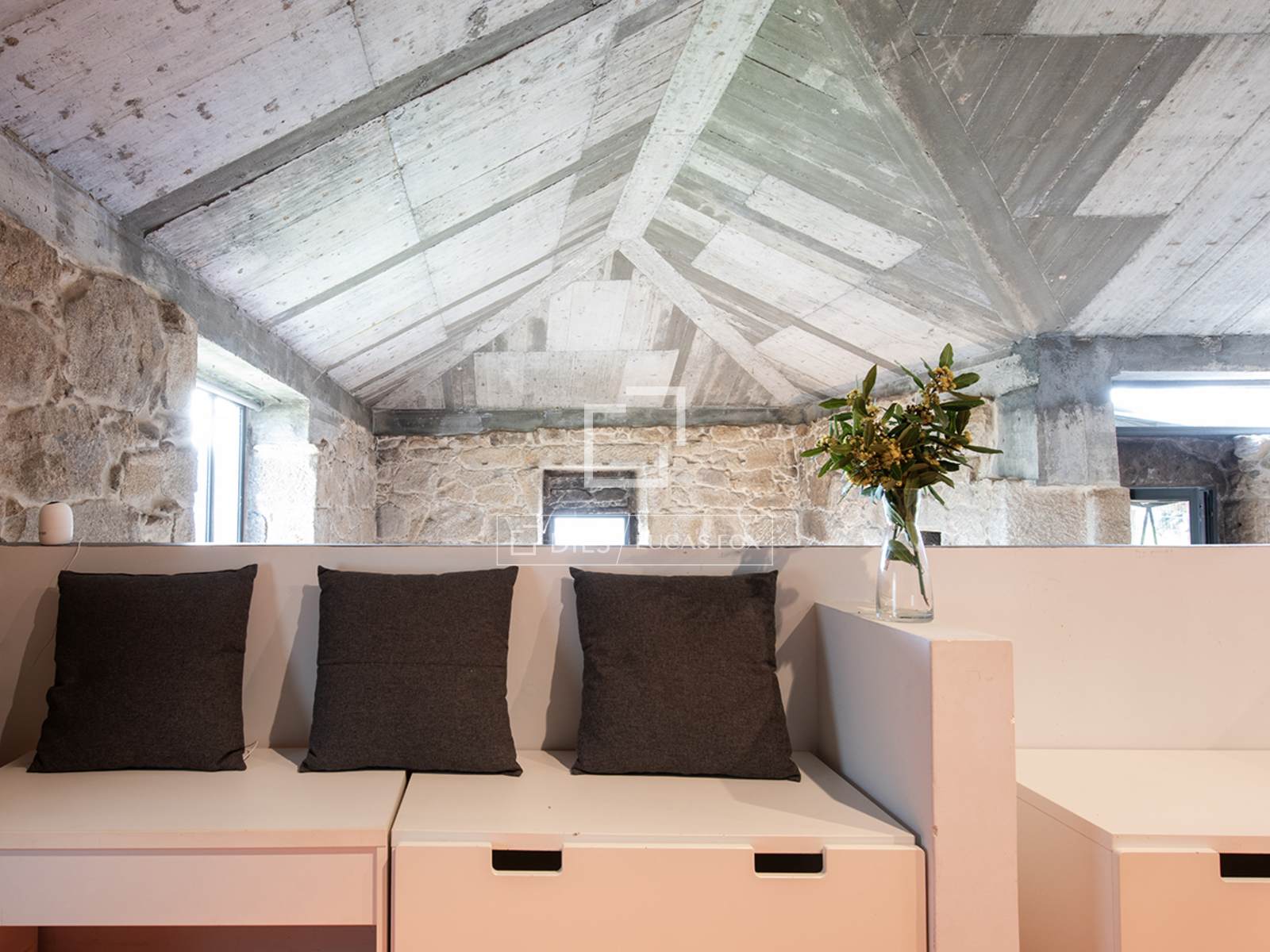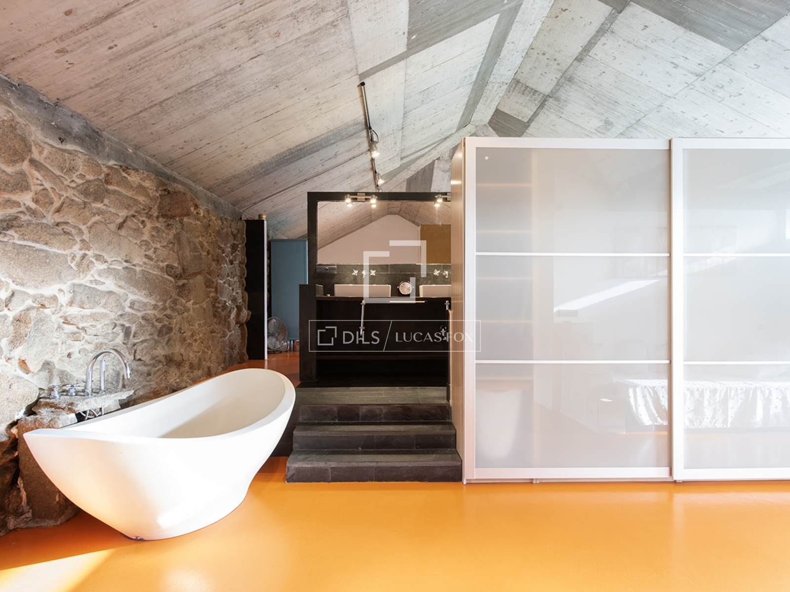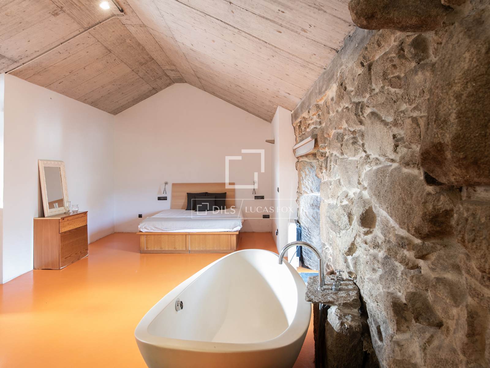 Un escalier central mène à un premier étage aménagé en mezzanine ouverte. On y trouve d'abord un espace bureau, puis, à gauche, une grande chambre double avec dressing, salle de bains attenante et baignoire îlot. À droite se trouve une chambre simple avec sa propre salle d'eau. Actuellement, aucune porte ne sépare ces espaces, ce qui confère à l'intérieur une atmosphère fluide et moderne, idéale pour les couples ou les familles avec de jeunes enfants. Si une configuration plus définie est souhaitée, des cloisons peuvent être facilement installées. Il est également possible d'agrandir la surface habitable en exploitant l'espace ouvert situé au-dessus du salon et de la cuisine. En résumé, cette propriété offre une grande flexibilité et un mariage original entre un style contemporain audacieux et la pierre apparente traditionnelle.