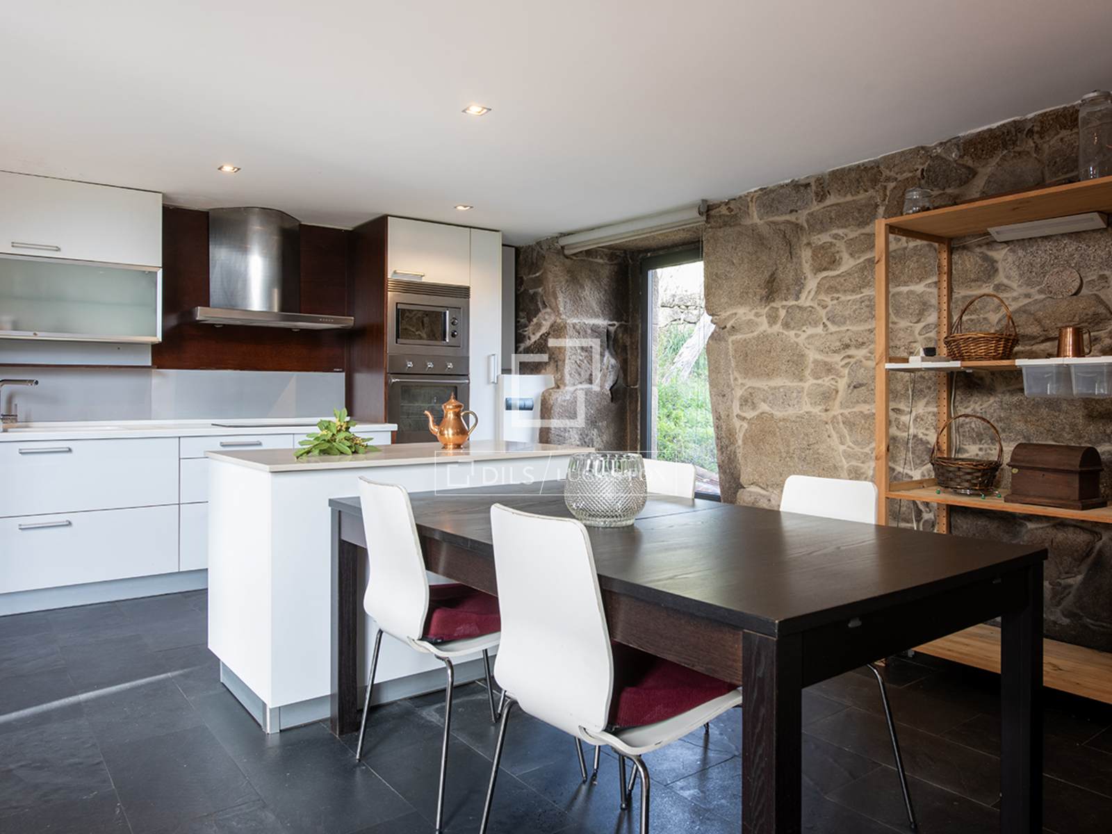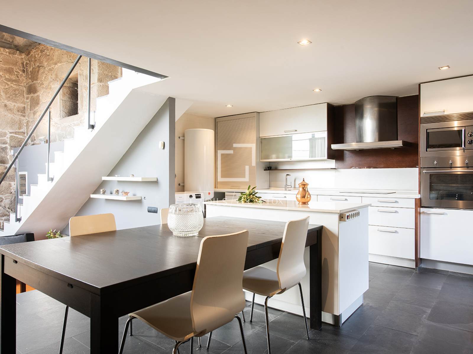 L'entrée principale donne accès à un vaste hall d'accueil qui s'ouvre sur une galerie d'environ 40 mètres carrés, actuellement aménagée en salle de sport. Cet espace dessert également un cellier ou un office ainsi qu'une salle de bains avec douche au rez-de-chaussée. À droite se trouve l'entrée de la maison d'origine. Des murs de pierre centenaires encadrent un intérieur où le charme traditionnel se mêle harmonieusement au design contemporain. Les plafonds ouverts accentuent la hauteur sous plafond et mettent en valeur les poutres et charpentes d'origine au-dessus du séjour et de la salle à manger décloisonnés. Quelques marches mènent à la cuisine.