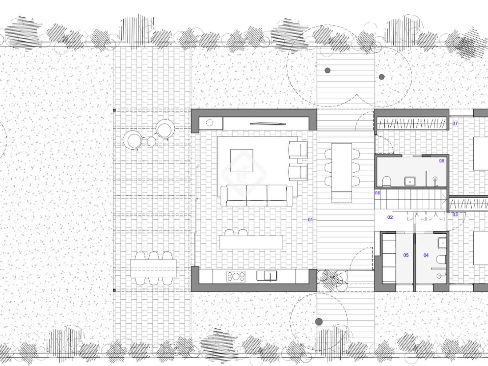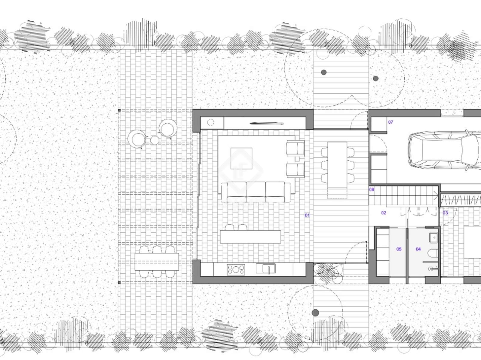 - Revêtement de sol : Sur l'ensemble du rez-de-chaussée (à l'exception du volume central), un sol en béton semi-fin poli est prévu, apportant continuité, solidité et esthétique contemporaine.