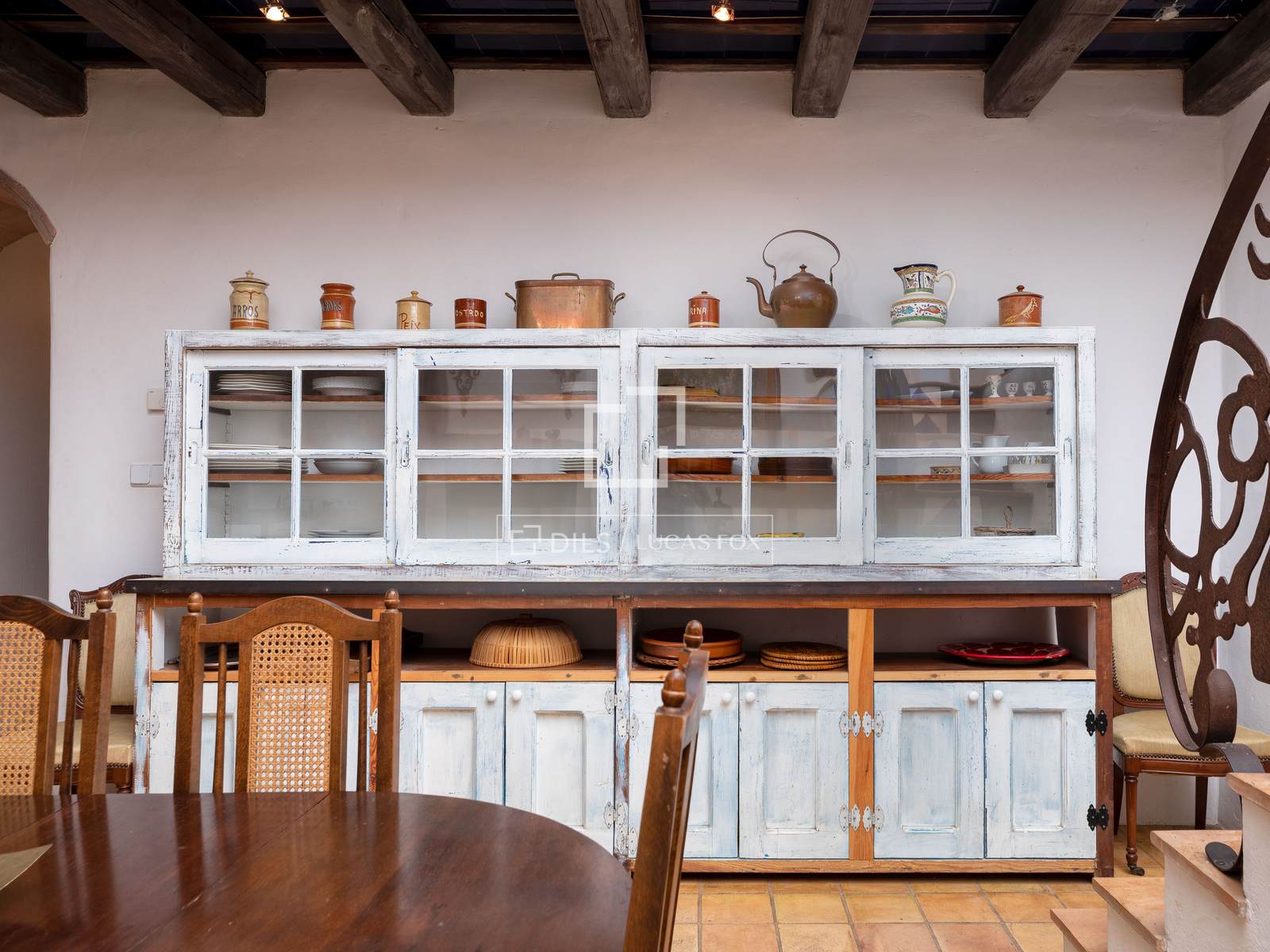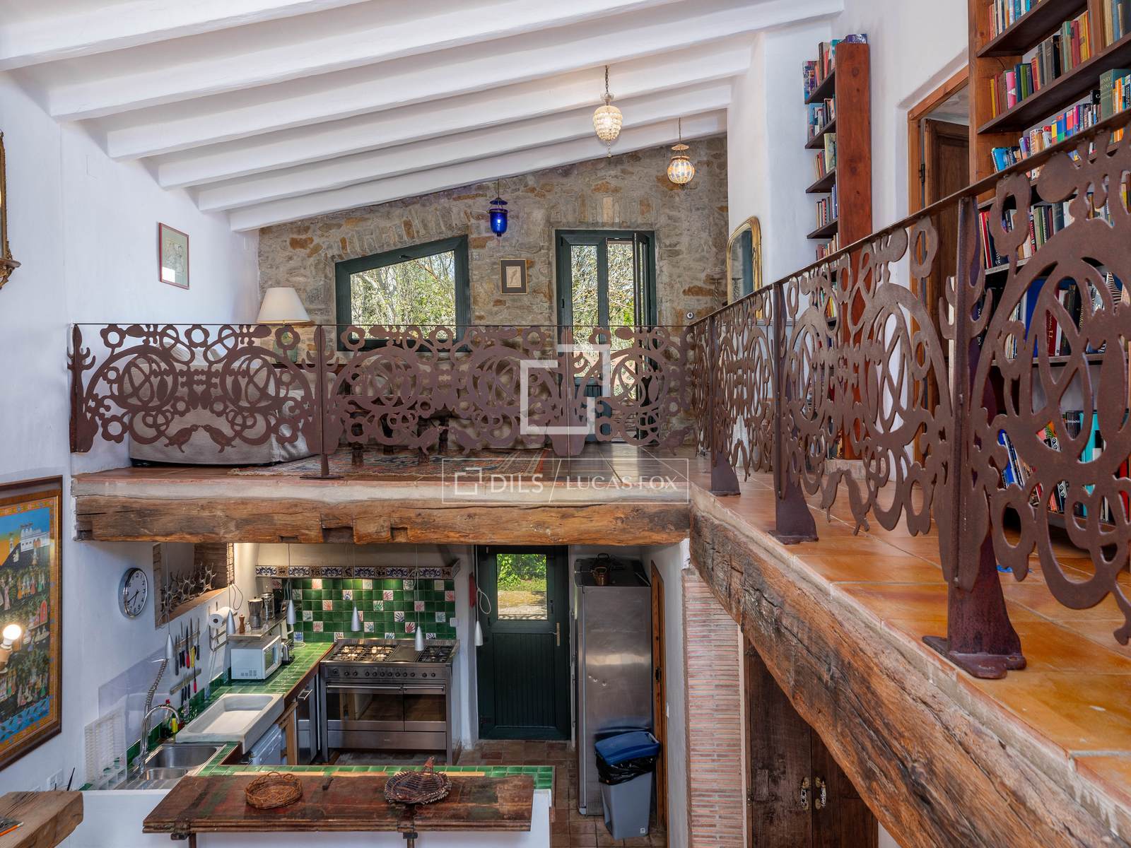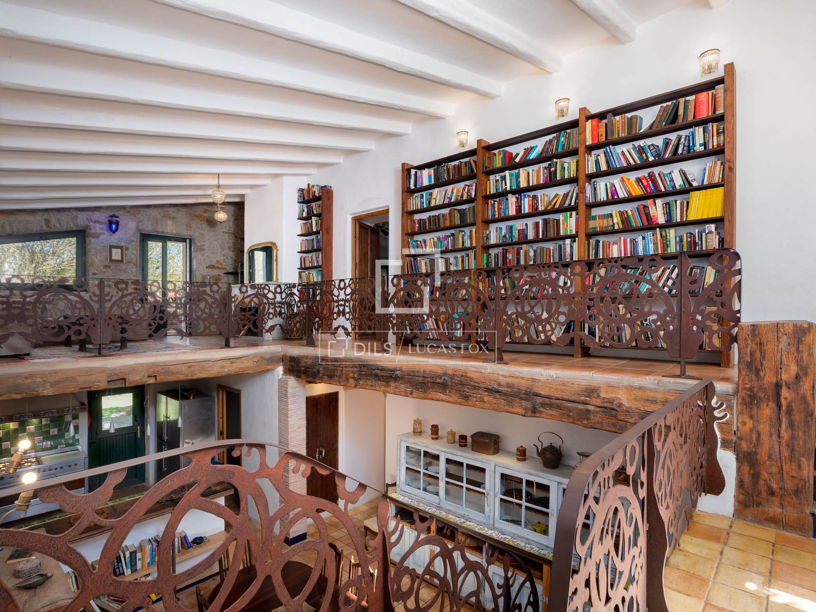 Avec un total de 1053 m² construits entre les deux bâtiments, la ferme orientée plein sud et très lumineuse est répartie sur trois étages. Au rez-de-chaussée, où se trouvaient autrefois les écuries, différents espaces avec des éléments d'origine ont été conservés, dont la salle à manger avec un plafond voûté en pierre et un cellier avec un plafond voûté en cannage. La cuisine avec office a un accès direct au jardin et à la terrasse en façade nord, qui offre un espace agréable à utiliser comme salle à manger d'été très fraîche. Le premier étage nous accueille avec un impressionnant salon avec son imposante cheminée et son plafond voûté, très lumineux et avec accès direct à une fantastique terrasse semi-couverte. Dans le même temps, le salon dessert les différentes chambres que l'on retrouve à cet étage : au total quatre grandes chambres avec trois salles de bains. Le deuxième étage, sous abri, dispose d'un espace ouvert utilisé comme entrepôt et de deux chambres doubles avec salle de bain.