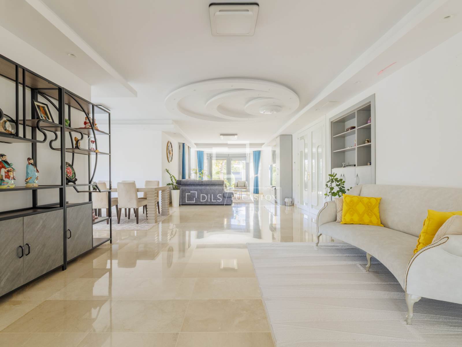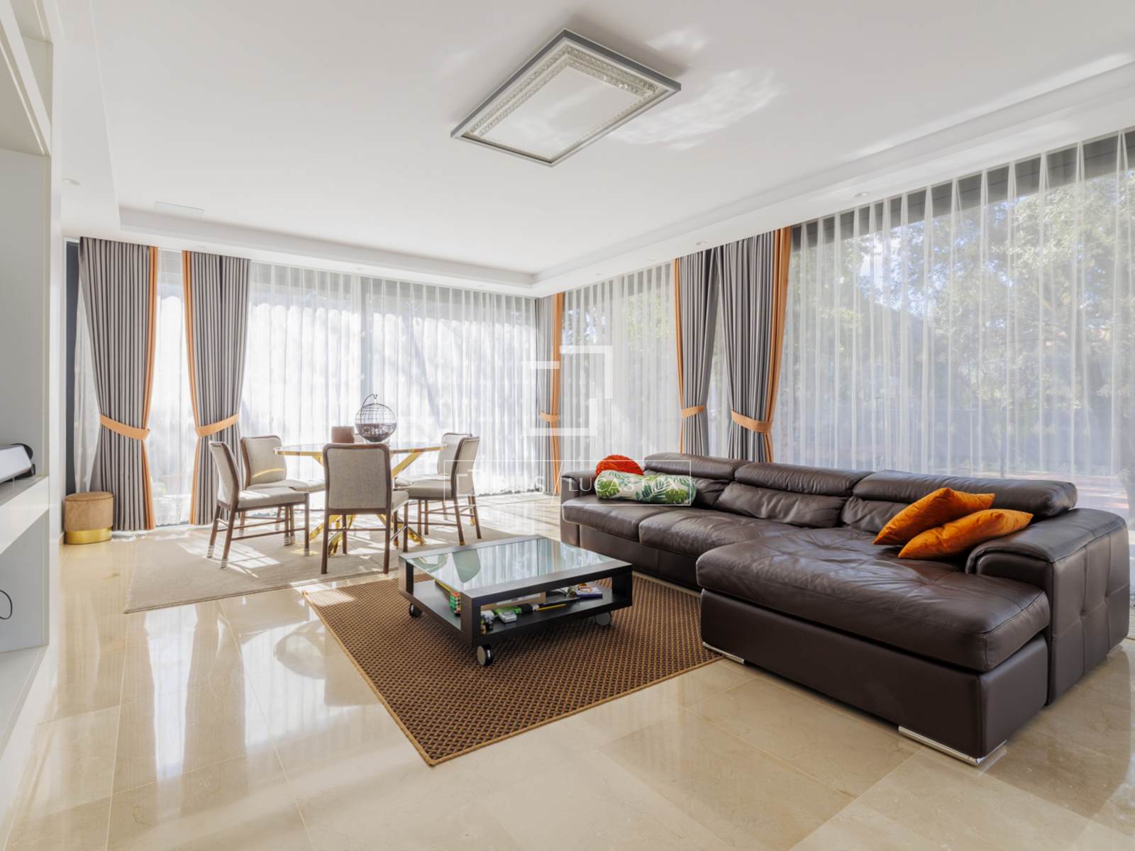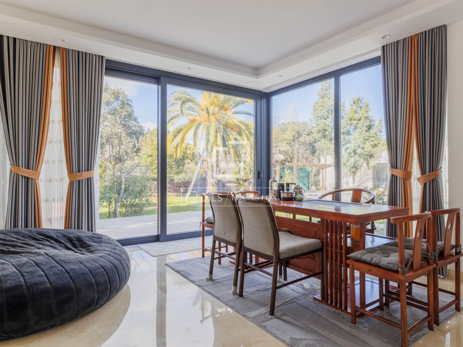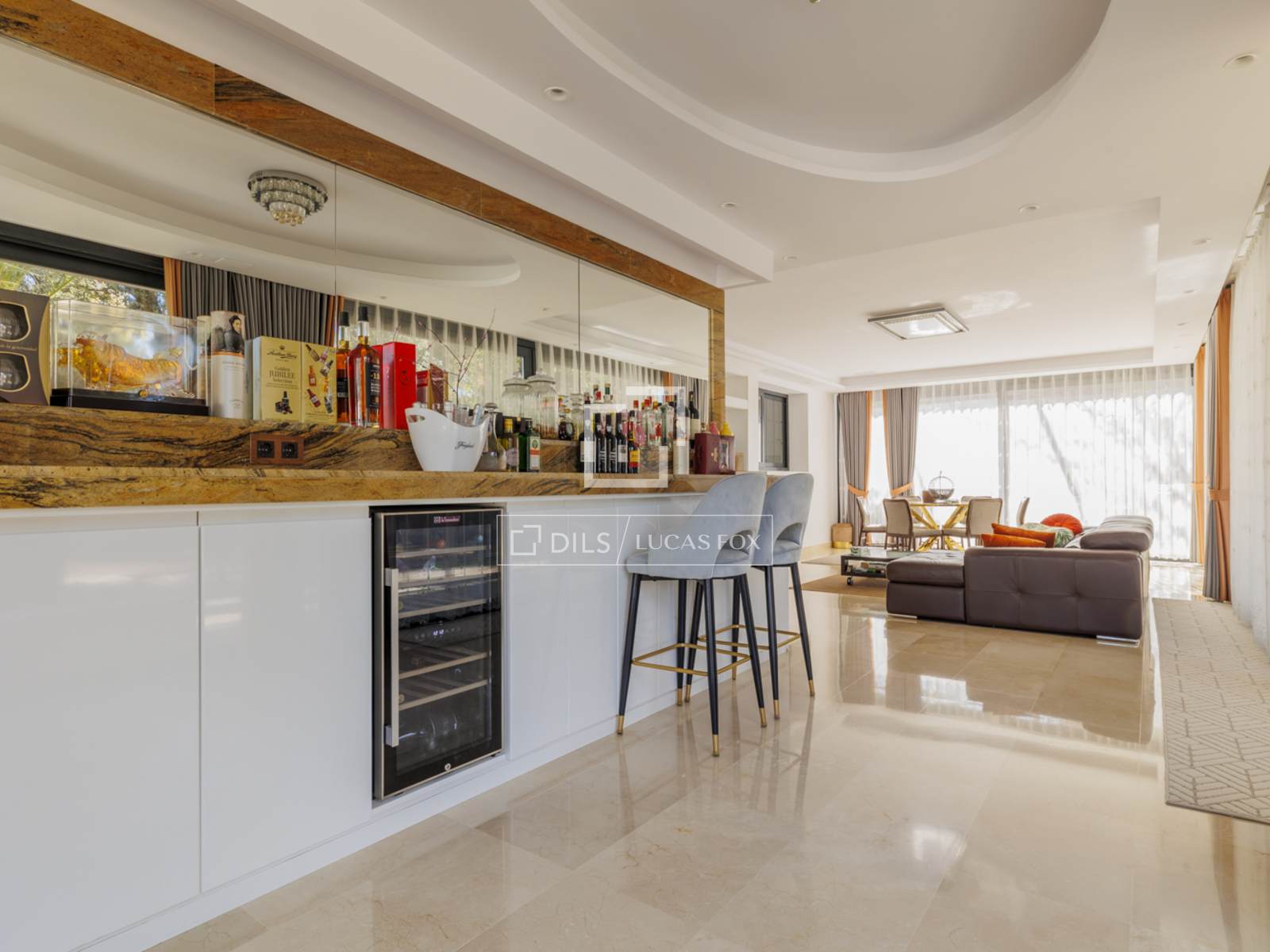 La rénovation a été conçue pour optimiser la luminosité et l'espace. De larges fenêtres encadrent les pièces principales, créant une atmosphère lumineuse et sereine. L'espace de vie comprend un salon-salle à manger élégant et spacieux, ouvert sur le jardin, et un grand salon de style piano-bar de 80 m², attenant à une magnifique cuisine.