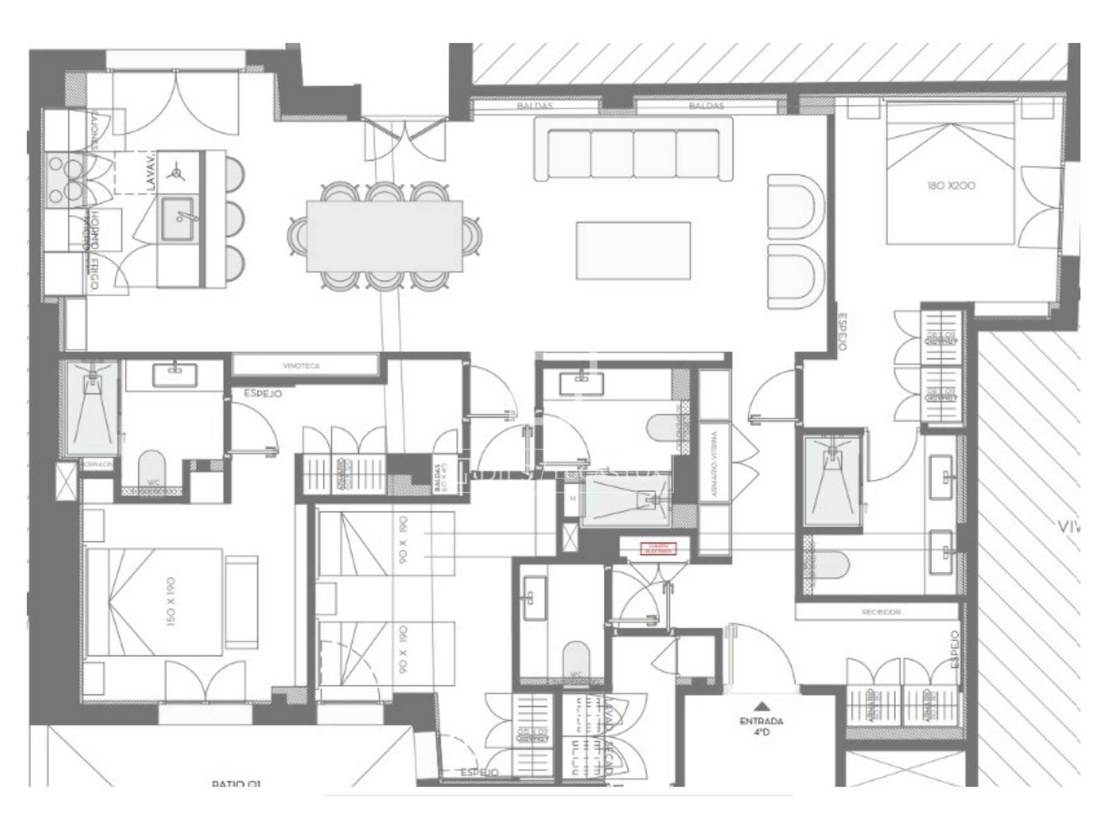Situé au quatrième étage et donnant sur une cour intérieure, cet appartement de 154 m² a été entièrement rénové selon un projet d'architecture et de design du studio Arctempus, offrant un style contemporain, élégant et fonctionnel. Il comprend trois chambres doubles spacieuses, trois salles de bains complètes, un WC invités, une buanderie et un espace de vie ouvert et bien agencé avec salon, salle à manger et cuisine entièrement équipée.