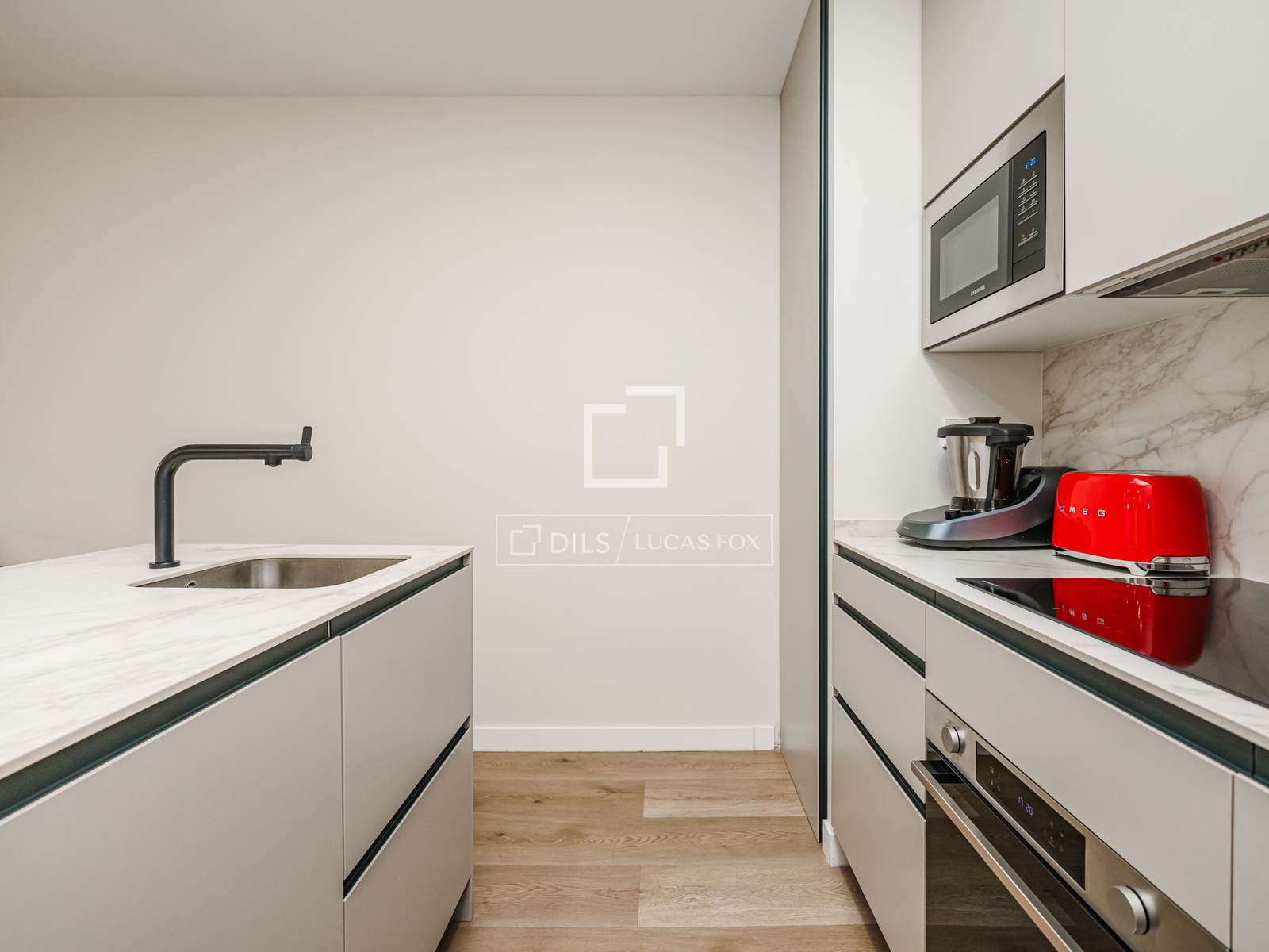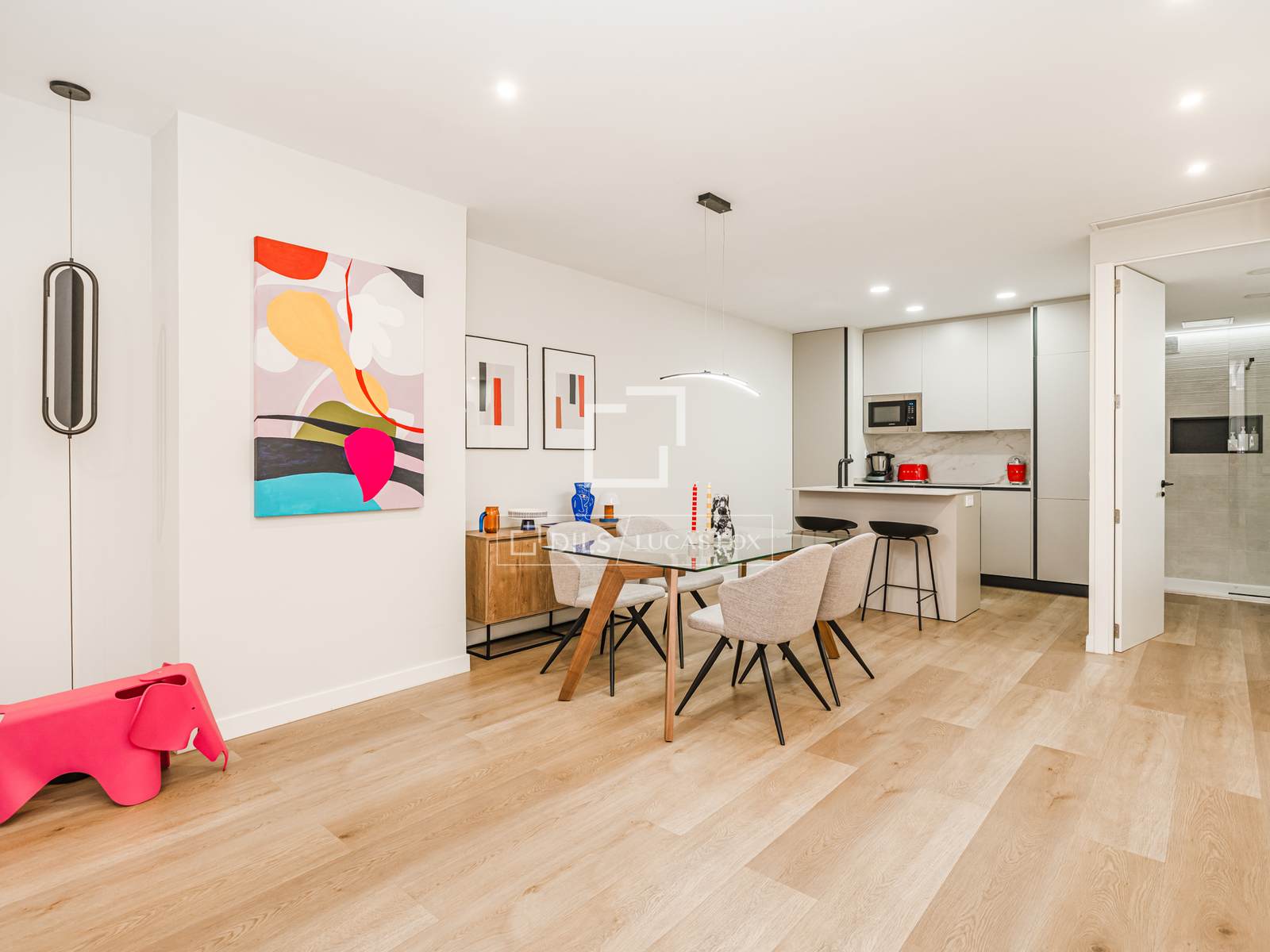 Cet appartement offre un agencement confortable et fonctionnel, comprenant un vaste séjour-salle à manger avec cuisine ouverte, deux chambres et une salle de bains. Les espaces sont optimisés, offrant une sensation d'espace et facilitant la circulation tout au long de la journée.