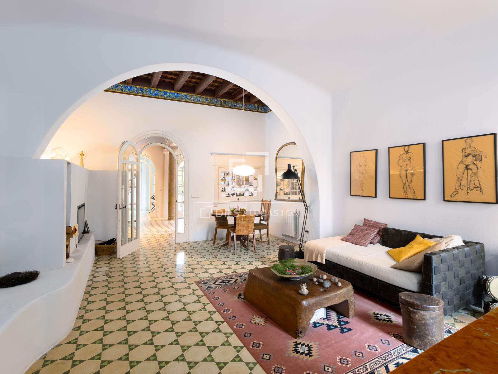 À l'intérieur, la maison a conservé de précieux éléments architecturaux d'origine : sols en carreaux hydrauliques, hauts plafonds, vitraux, colonnes de marbre et un imposant escalier en bois massif. Le hall d'entrée dessert plusieurs pièces spacieuses et lumineuses, dont un salon accueillant avec une baie vitrée et une magnifique et vaste salle à manger-séjour donnant directement sur le jardin.